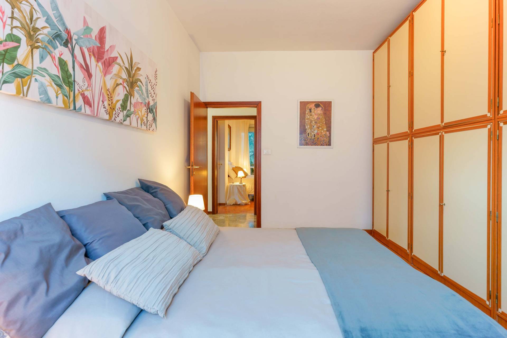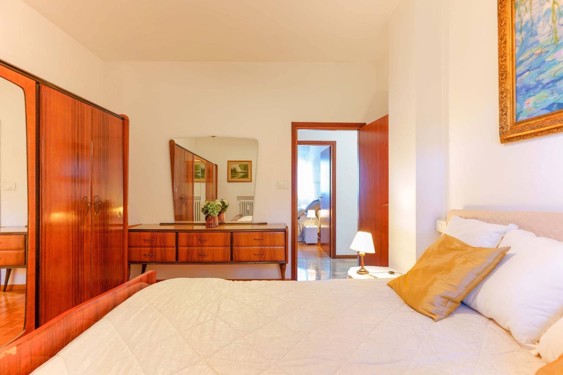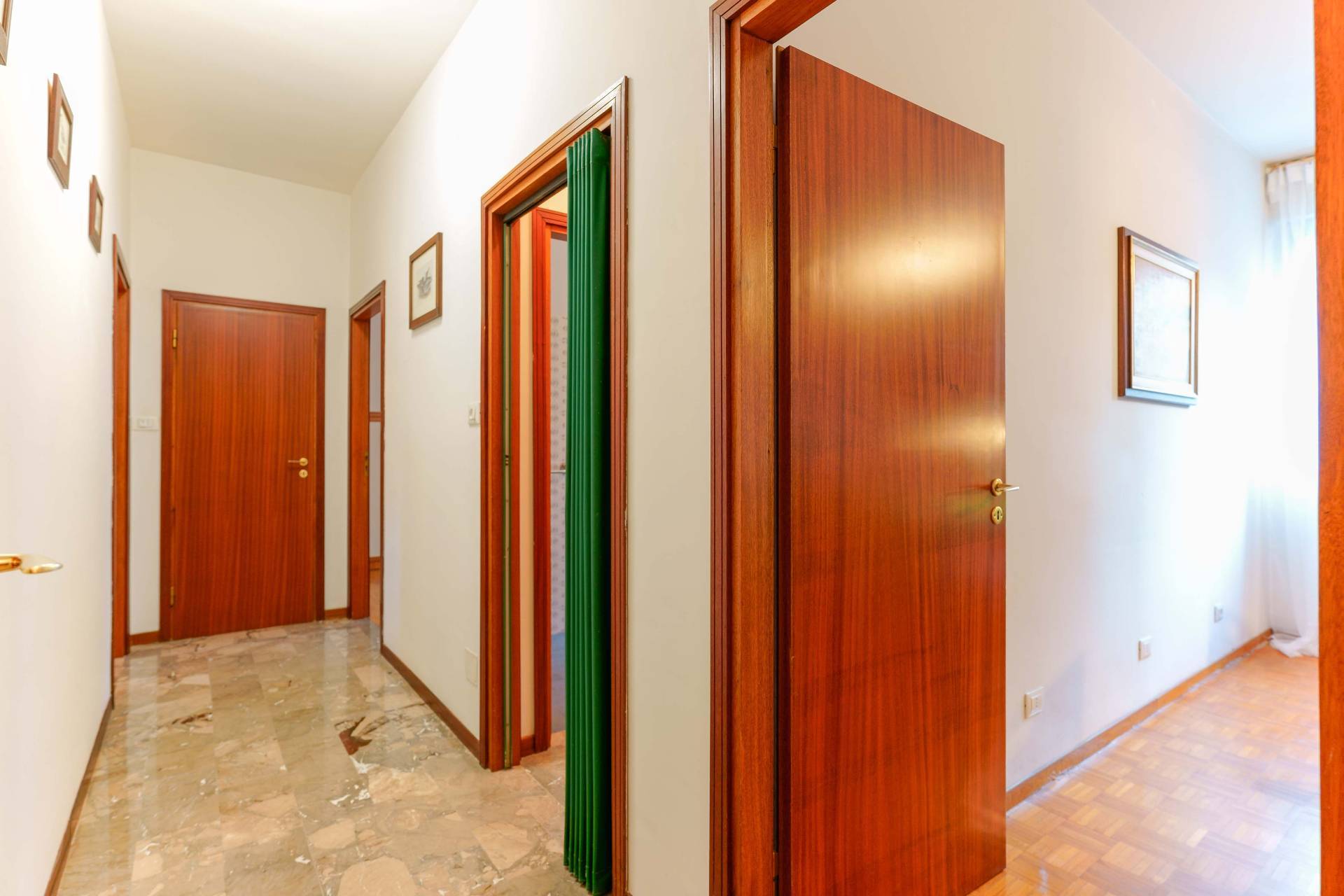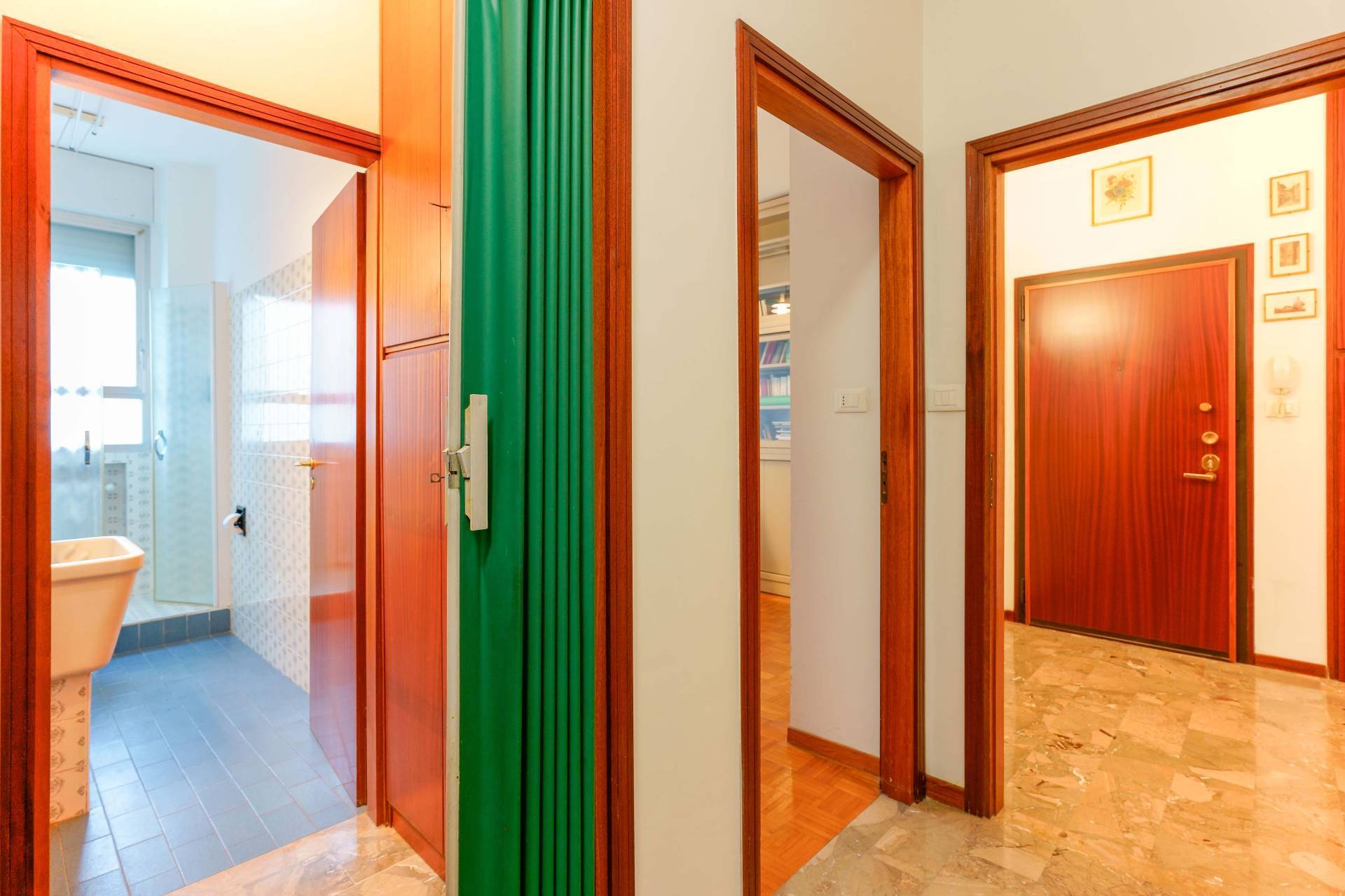 Un corridoio/disimpegno ben organizzato conduce alla zona notte, composta da tre camere matrimoniali di generose dimensioni, una delle quali è attualmente utilizzata come ufficio, oltre a due bagni finestrati. La veranda è accessibile, oltre che dal soggiorno e dalla cucina, anche da una delle tre camere, aumentando ulteriormente la vivibilità degli spazi.