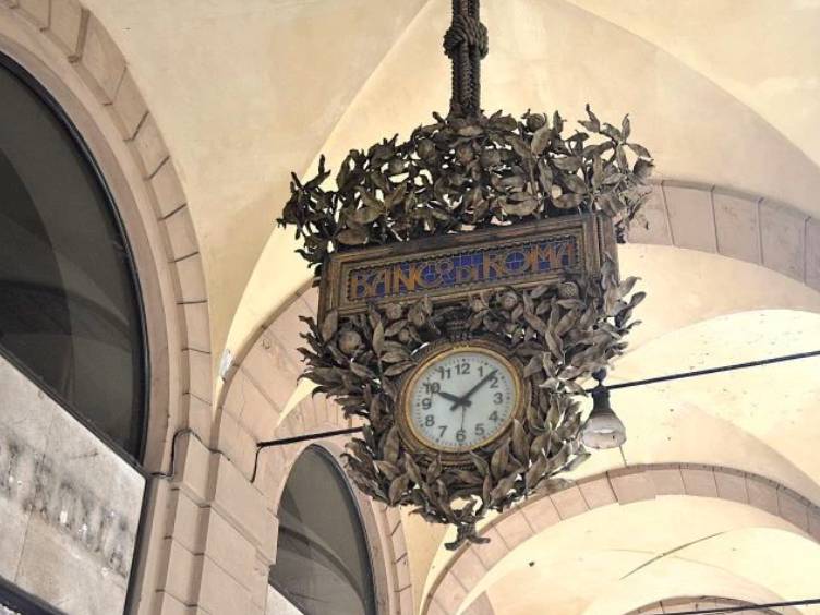 Il portico fu rifatto nel 1815 dall’architetto Angelo Venturoli, per uniformarlo al vicino edificio e formare un unico portico, detto della Gabella. Qui sotto ancora domina il grande orologio liberty del Banco di Roma, realizzato dalla ditta di Sante Mingazzi, con una ricca cimasa di foglie. Installato nel 1919, è uno degli esempi più autorevoli della particolare versione dell'art nouveau, che caratterizzò la belle époque bolognese.