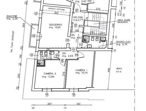 L'Appartamento, di 86 mq circa, è situato al primo piano ed è formato da: ingresso, disimpegno, soggiorno/pranzo con balcone e cucina a vista, due camere, due bagni (dei quali uno cieco). Inoltre, è dotato di una grande cantina al piano seminterrato e di uno spazio per parcheggiare l'auto nel cortile chiuso da cancello (di fianco ad uno spazio analogo, di proprietà di un altro condomino).